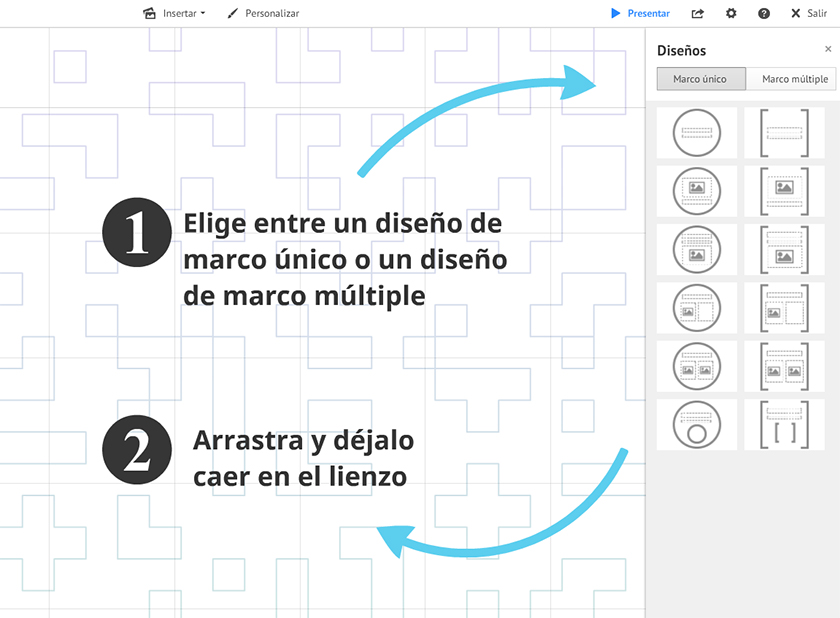 2. Tras seleccionar 'Diseños...', aparecerá un panel lateral que te permite elegir un marco único o un marco múltiple. Haz clic en la vista en miniatura que prefieras para insertar ese diseño en el prezi.
