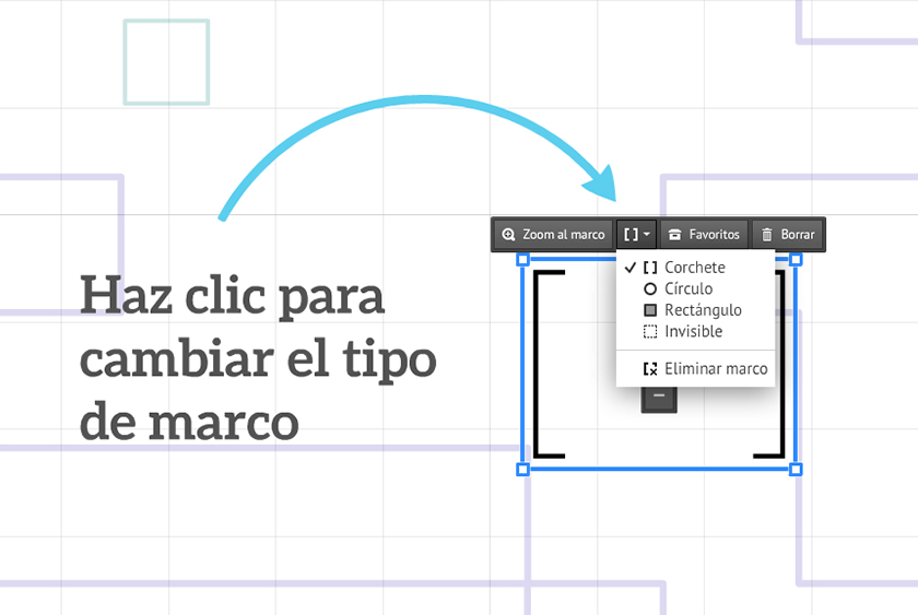 Se puede modificar el tipo (la forma) del marco haciendo clic en él y seleccionando el icono marco que aparece. Al hacer clic aquí, se mostrará un menú desplegable de opciones para que elijas la que más te guste. Mira la captura de pantalla inferior para ver un ejemplo.