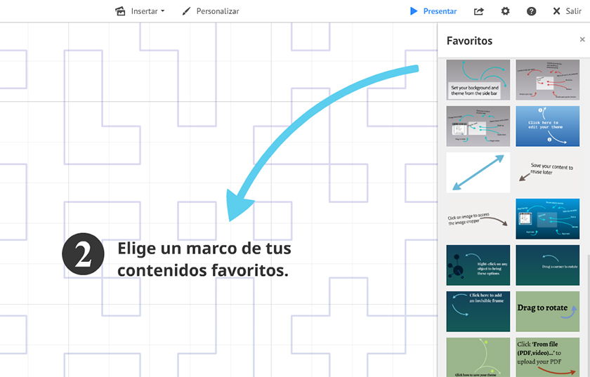 Haz clic en Insertar* desde el menú superior. Elige Favoritos para abrir la biblioteca del contenido guardado.Selecciona el marco que quieres utilizar y arrástralo directamente al lienzo de prezi.
